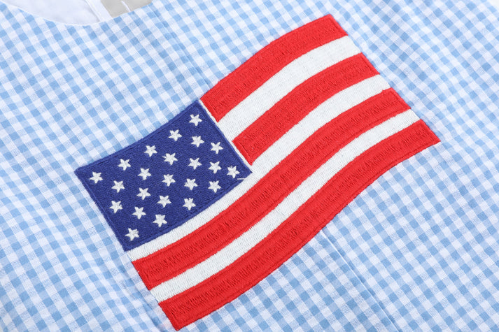 Let your All-American Boy show his red, white, & blue spirit in these blue gingham shortalls! Perfect for the 4th of July, these shorts feature a classic gingham print, pockets with trim details, red and blue buttons at the shoulder to allow adjustable sizing and snaps at the crotch for easy diaper changes. Independence Day just got cuter!