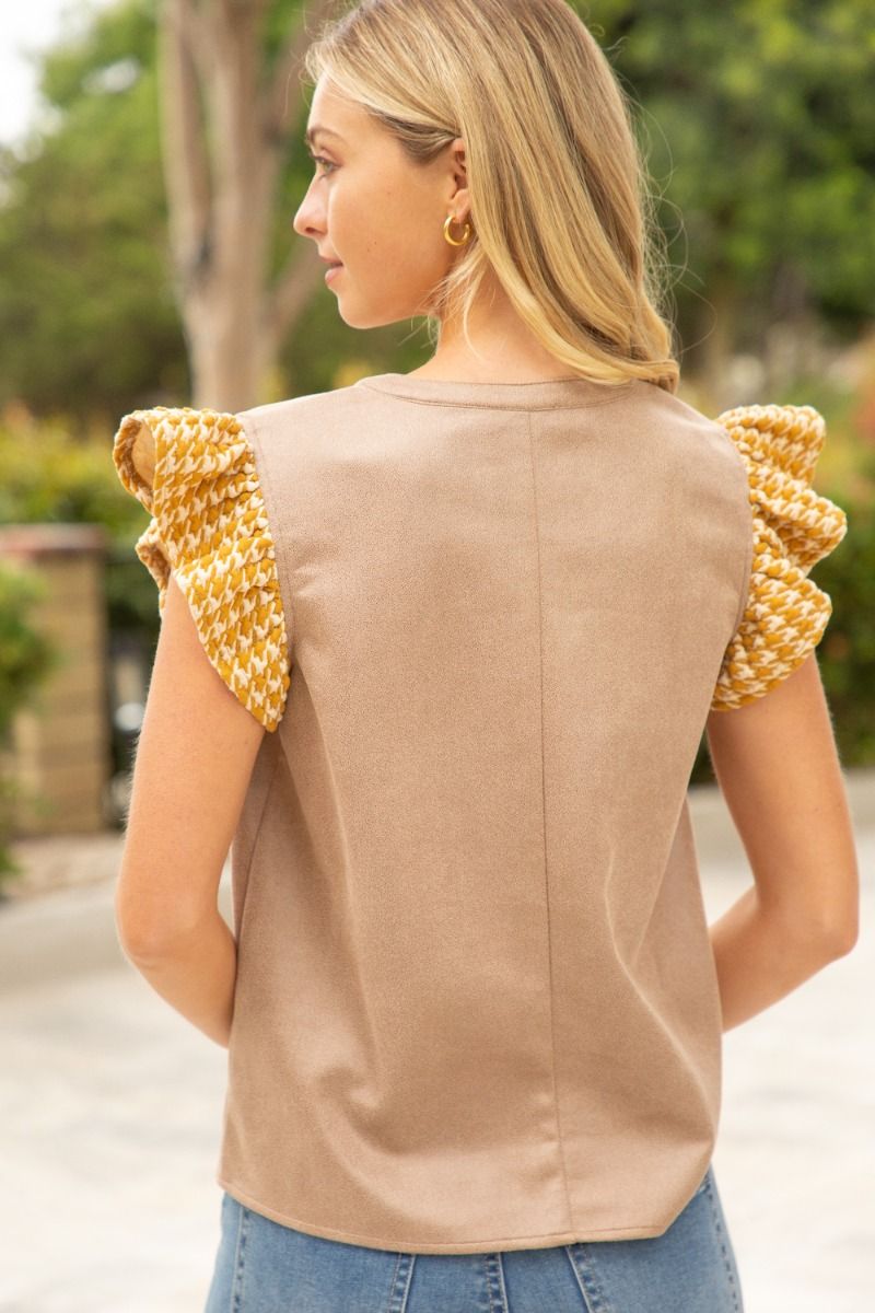 V neck with collar stand • Ruffle sleeve • Faux leather fabric on body • Houndstooth printed textured knit fabric on sleeve • Model height 5' 10", wearing size Small